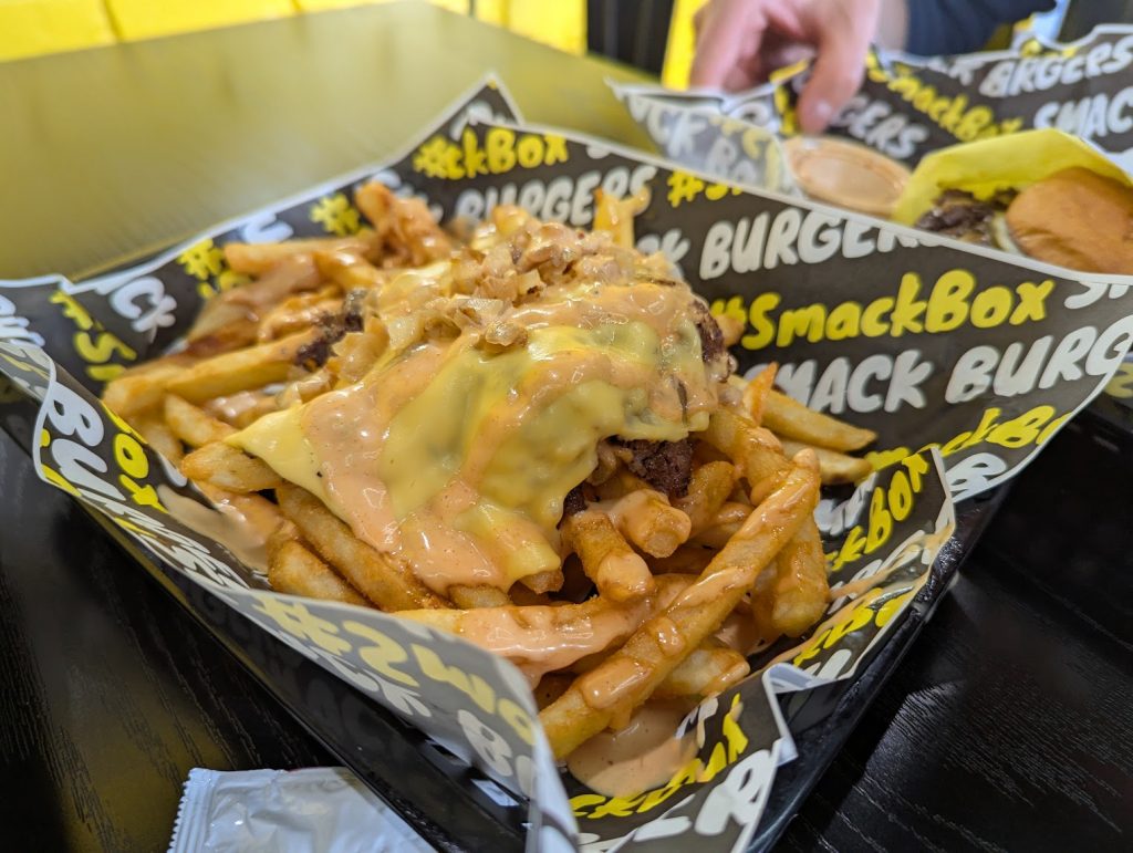 DK ordered the Big Smack and an order of Smack Fries (patty, American cheese, grilled onions, smack sauce, $9).