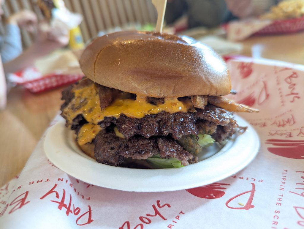 These are messy burgers with lots of stuff on them. The key is to never put the burger down so you maintain your grip on the burger.