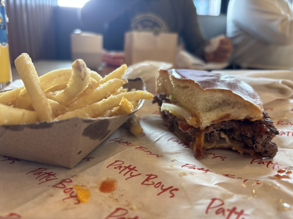 Wayne got the Patty Boy with lamb patties – white cheddar, beef pepperoni chips, tomato, hickory sauce, mustard pickle slaw ($16). Wayne has a thing for ordering a burger named after the restaurant and also lamb. To be fair, I still think about that lamb burger we had at Badmaash 🤔
